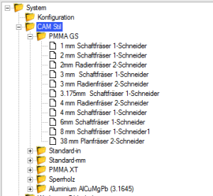 Ich erzeuge für jedes Werkzeug einen CAM-Stil und ordne ihn in unterschiedlichen Bibliotheken nach Material. Jedes Werkzeug wird beim Fräsen ja für unterschiedliche Materialien verwendet. Je nach Material ändern sich nur die zum Werkzeug gehörenden Schnittdaten.