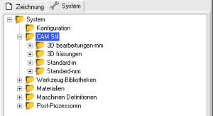 Unter dem Reiter System, finden Sie die Konfigurationseinstellungen und Bibliotheken zu den CAM-Stilen, Materialien, Werkzeugen und Maschinendefinitionen.